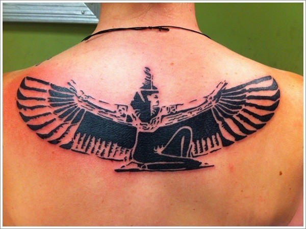 背部黑色埃及神伊西斯与翅膀纹身图案