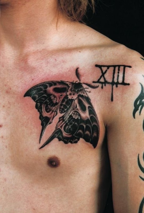 胸部黑色死亡飞蛾纹身图案