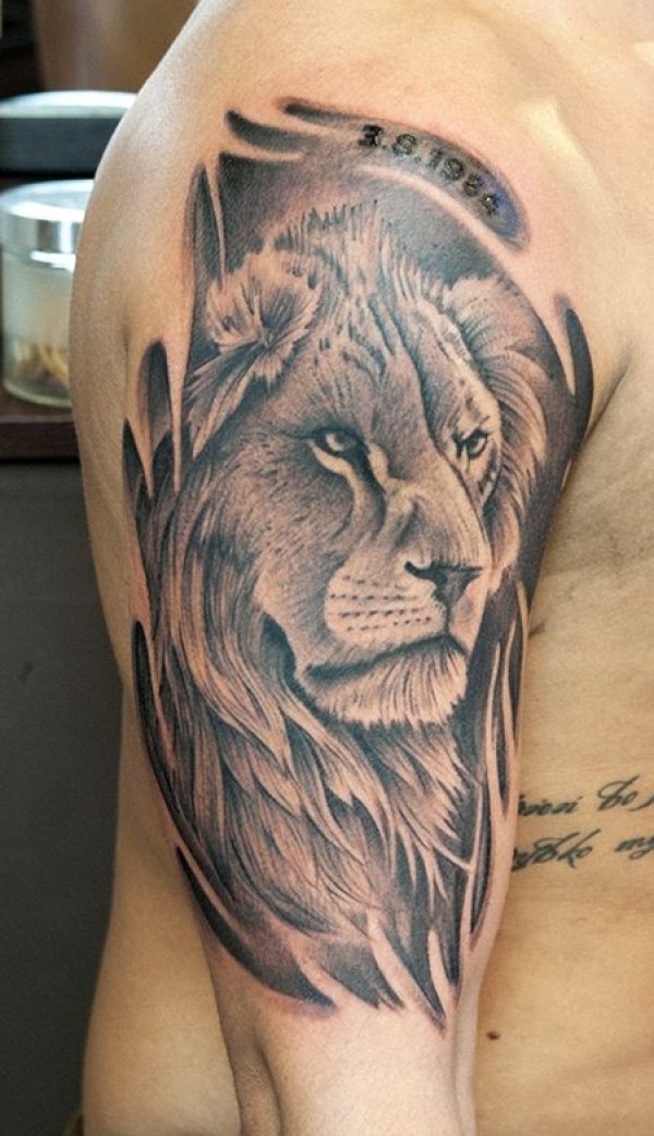 黑灰大臂狮子头像纹身图案