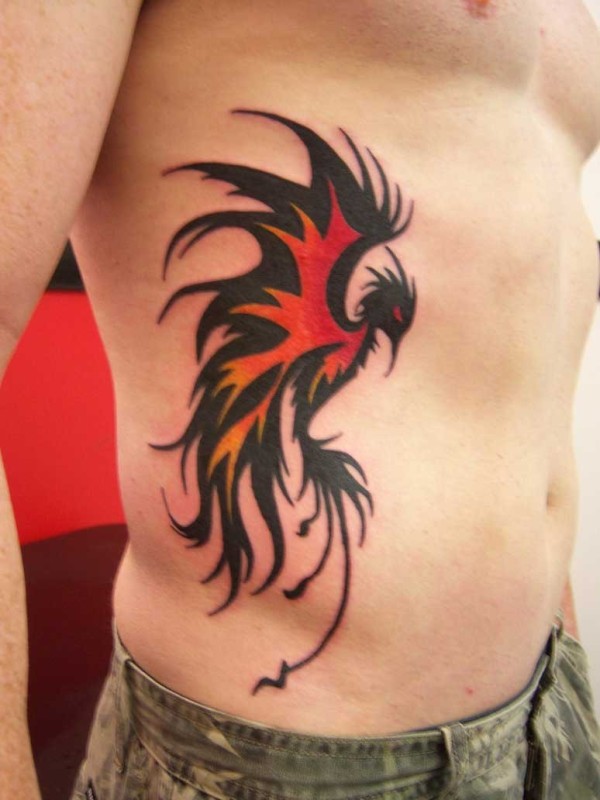 红色和黑色的凤凰图腾侧肋纹身图案
