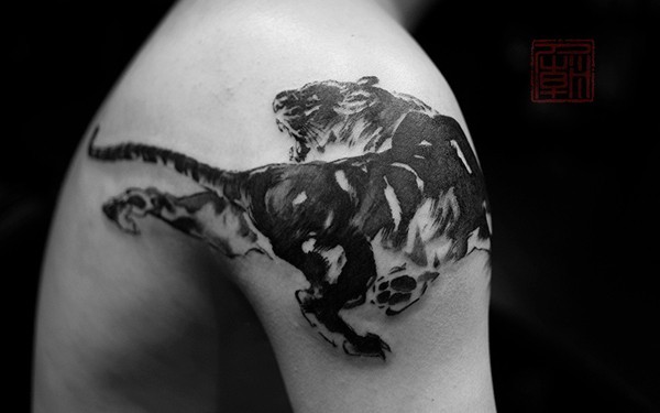 肩部的黑色老虎纹身图案