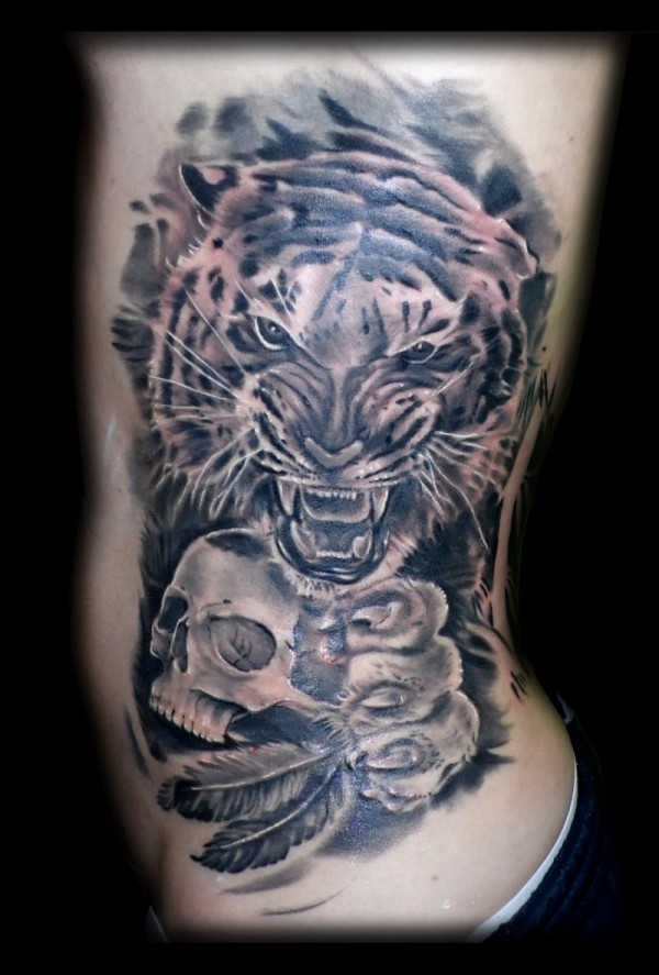 老虎和骷髅黑色侧肋纹身图案