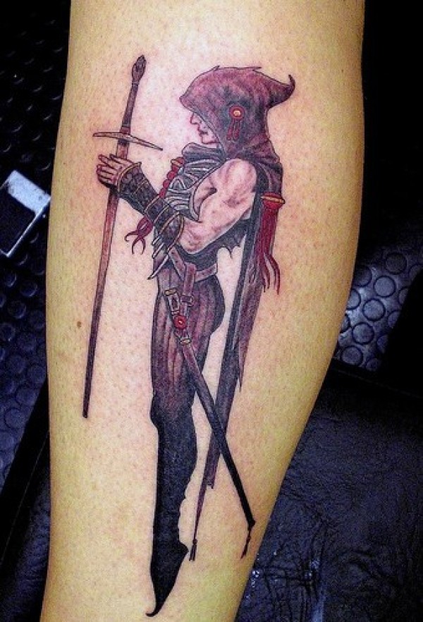 小腿黑色恶魔男子和锋利的枪纹身图案