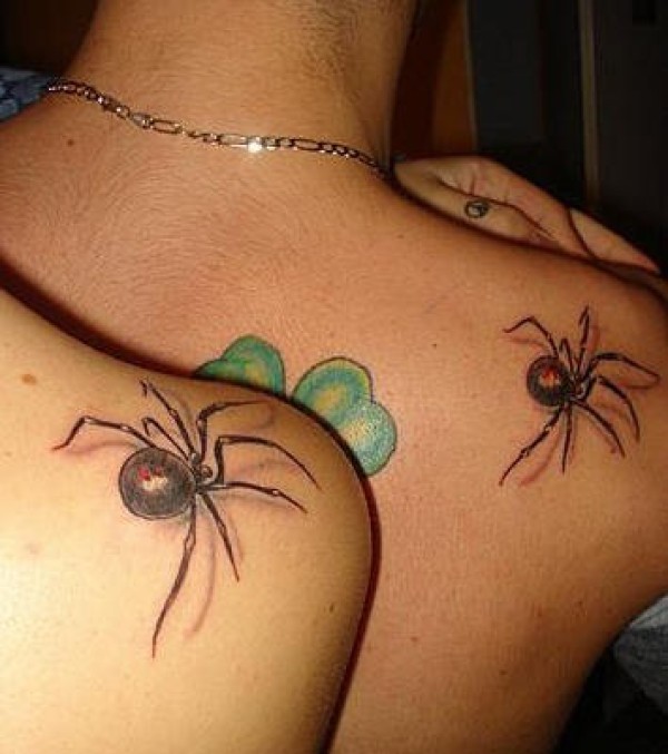 肩部逼真3D蜘蛛和绿色三叶草纹身图案
