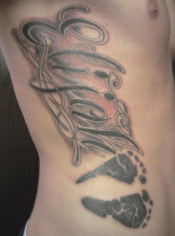 侧肋花体字母和小孩脚印纹身图案