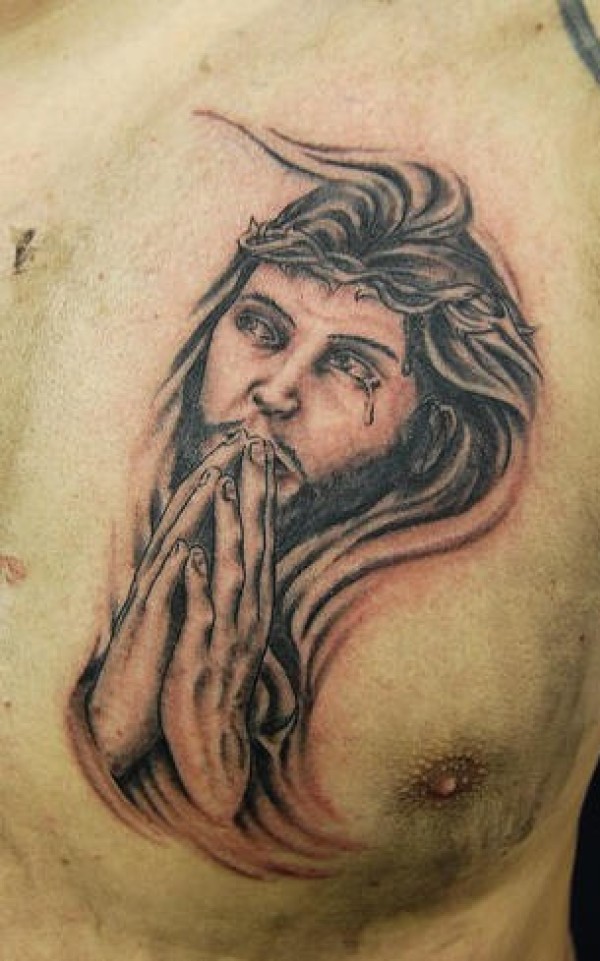 胸部祈祷的基督和荆棘冠纹身图案