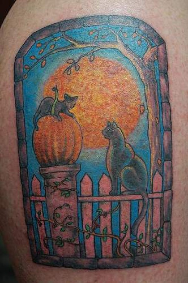 黑猫和夜景纹身图案