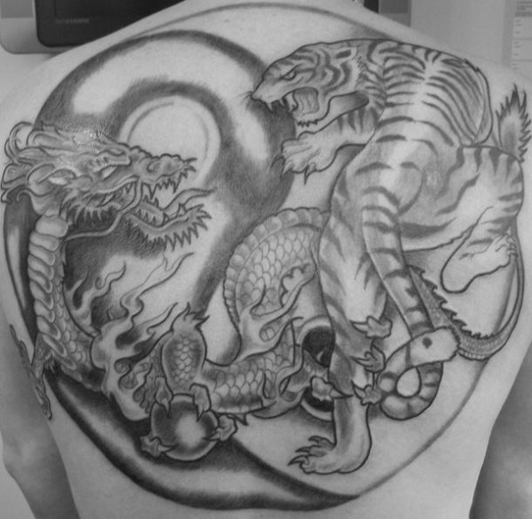 背部老虎与龙战斗纹身图案
