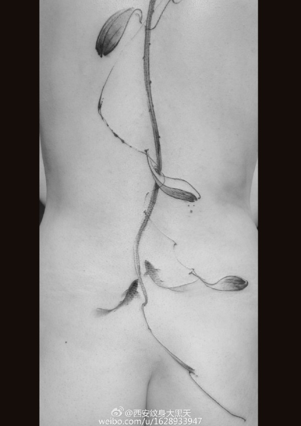 女生后腰纹身黑白灰风格抽象线条纹身图案