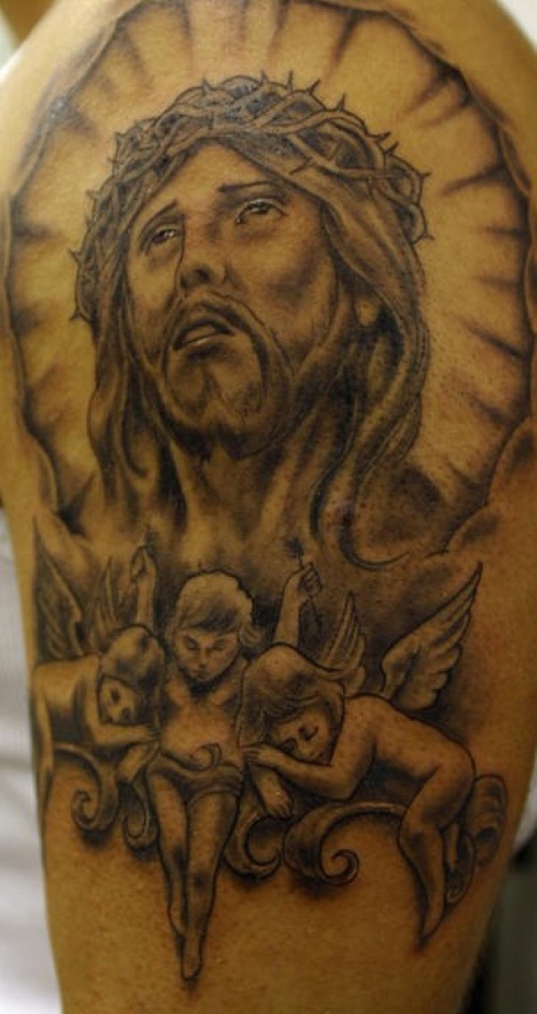 耶稣和天使黑色纹身图案