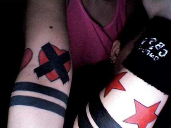 简单的黑色和红色心形线条星星手腕纹身图案