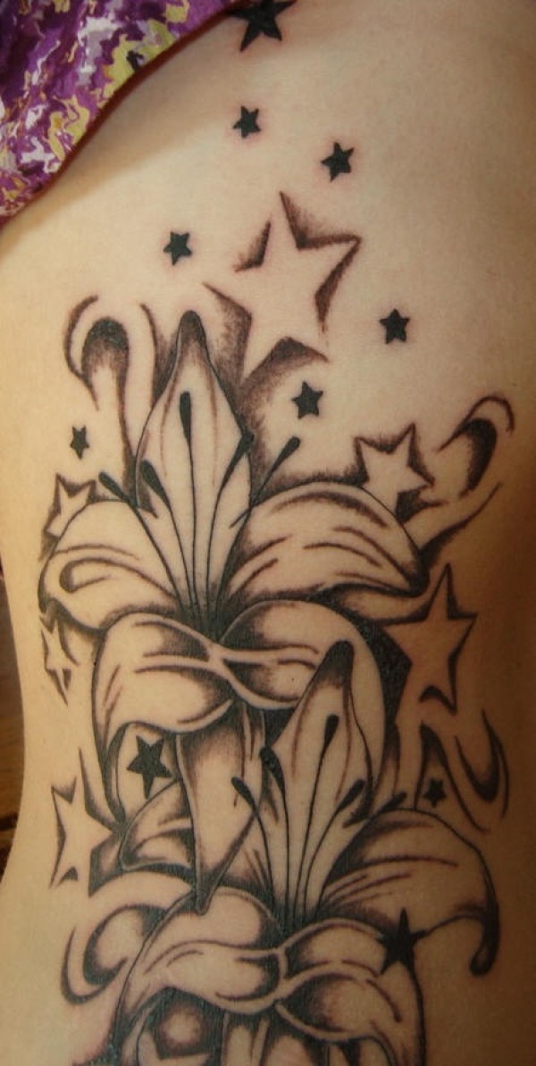 侧肋百合花与星星黑色纹身图案