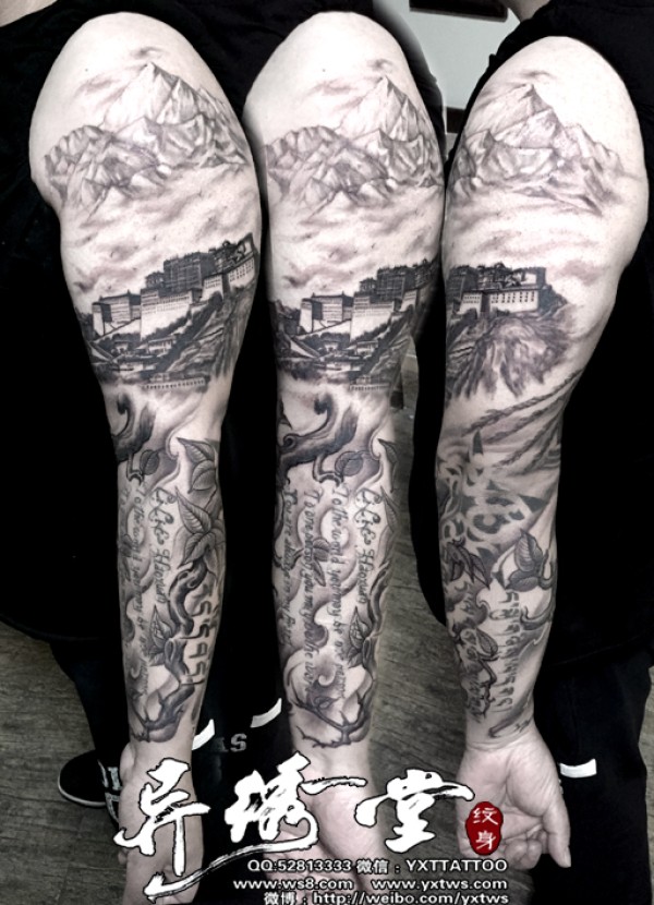 布达拉宫珠峰佛塔经帆菩提树家人名字黑白花臂纹身