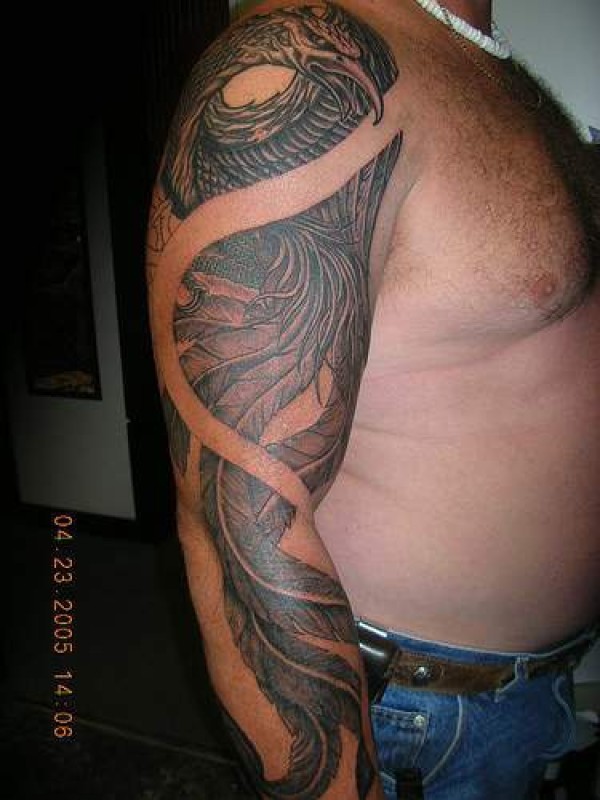 手臂精美的凤凰黑灰纹身图案