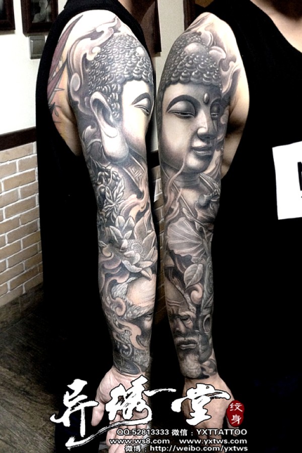 如来佛祖达摩虚空藏菩萨传统黑白花臂纹身