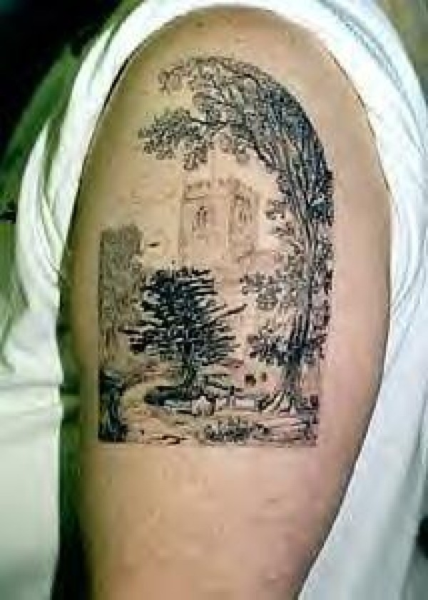 写实景观与树木黑灰纹身图案