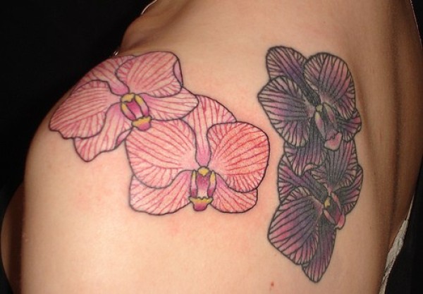 简约的红色和黑色兰花肩部纹身图案
