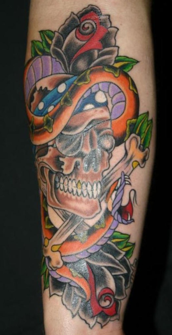 海盗骷髅蛇和黑玫瑰经典纹身图案