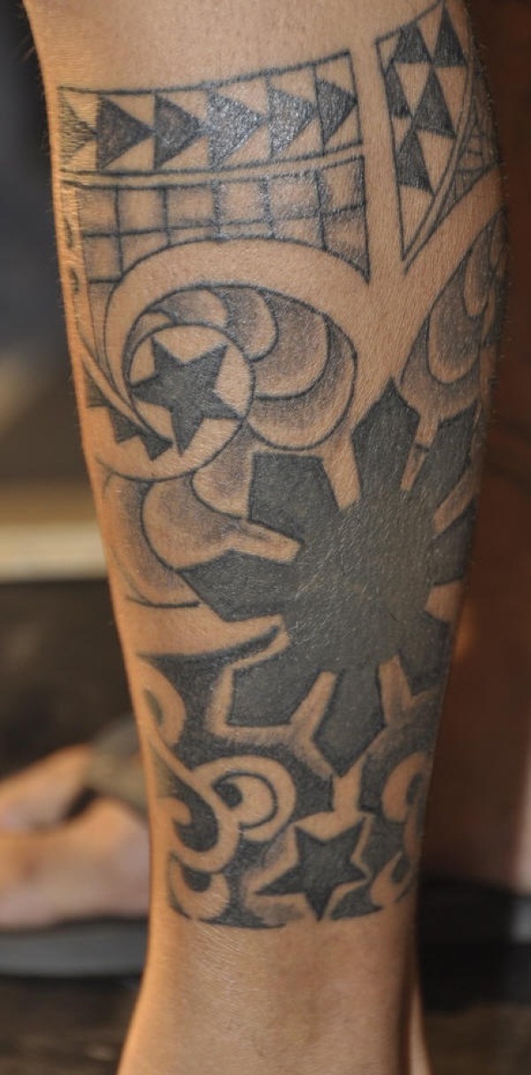 小腿黑灰星星几何图腾纹身图案