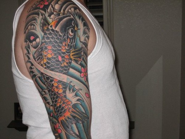 手臂黑色的鲤鱼和花朵海浪纹身图案