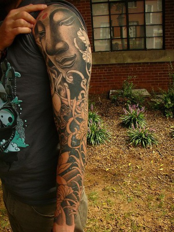 手臂黑灰佛像花卉纹身图案
