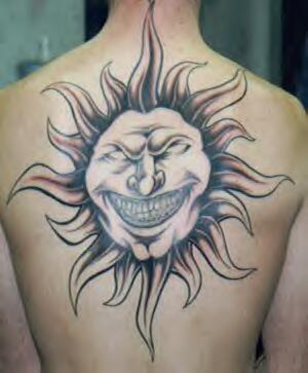 背部黑灰可怕的太阳纹身图案