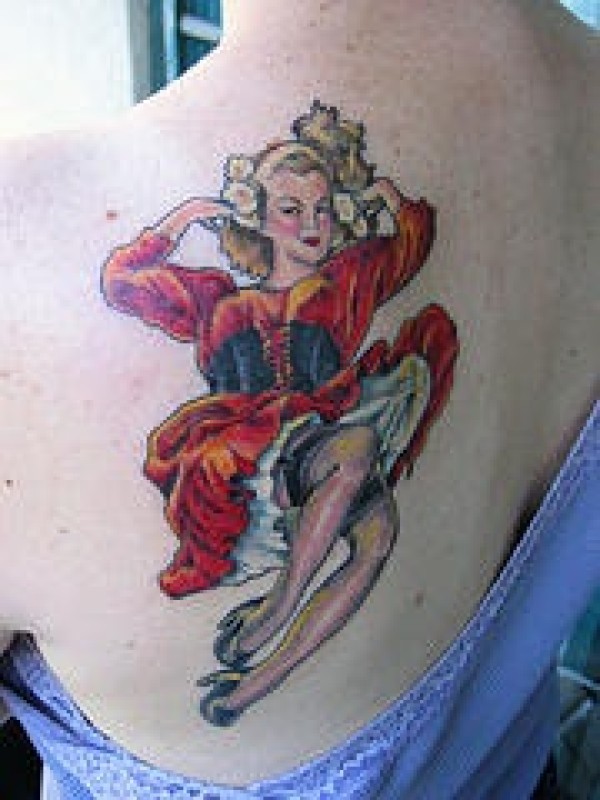 背部传统玛丽莲梦露和红色礼服纹身图案