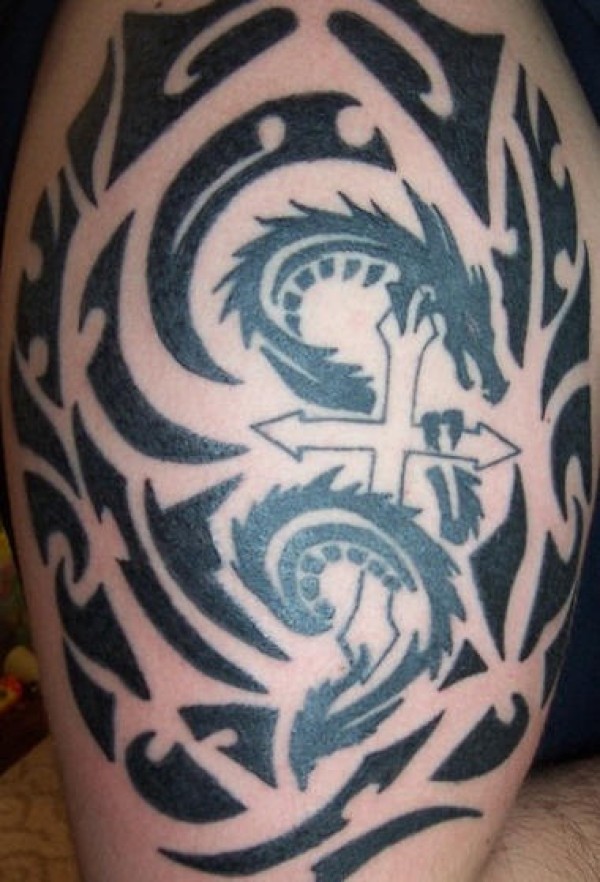 黑色部落龙和十字架图腾纹身图案