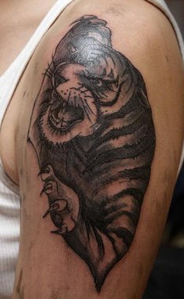 大臂精致的黑灰老虎纹身图案