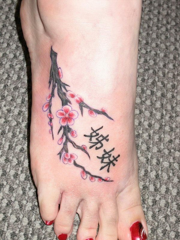 脚背可爱的樱花和汉字纹身图案