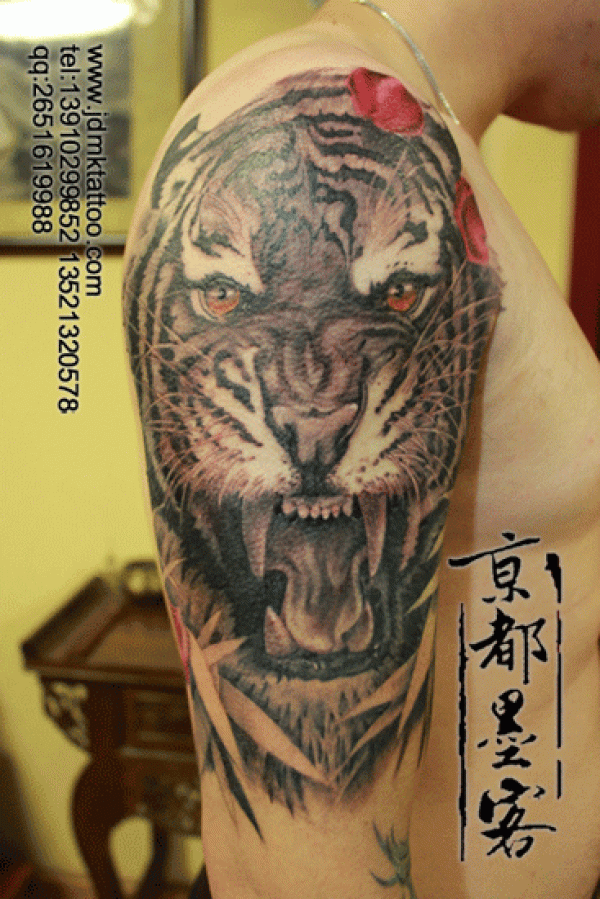 京都墨客纹身作品 包大臂老虎彩色纹身