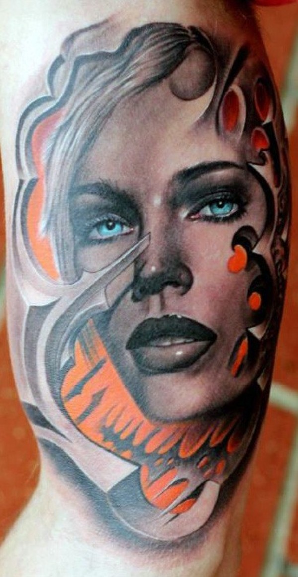 大臂插画风格蓝眼睛的女人肖像纹身图案