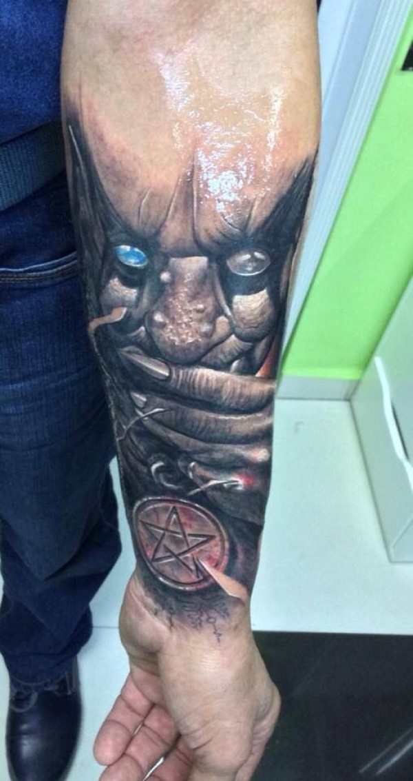 手臂恐怖风格彩色蓝眼睛怪物纹身图案
