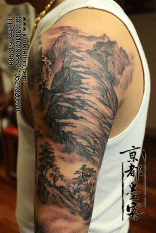 京都墨客纹身作品 整臂万马奔腾山水黑白纹身