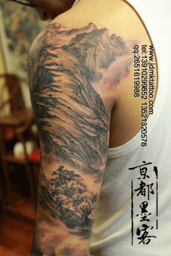 京都墨客纹身作品 整臂万马奔腾山水黑白纹身