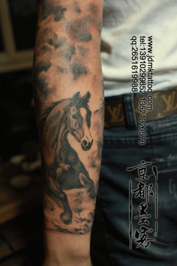 京都墨客纹身作品 整臂万马奔腾山水黑白纹身