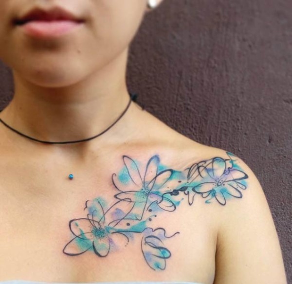 肩部奇妙的蓝色和紫色水彩花朵纹身图案
