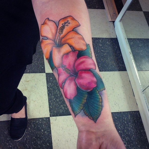 手臂黄色和粉红色的芙蓉花纹身图案