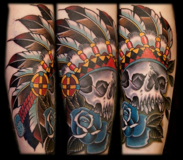 彩色印度风骷髅与蓝色玫瑰纹身图案