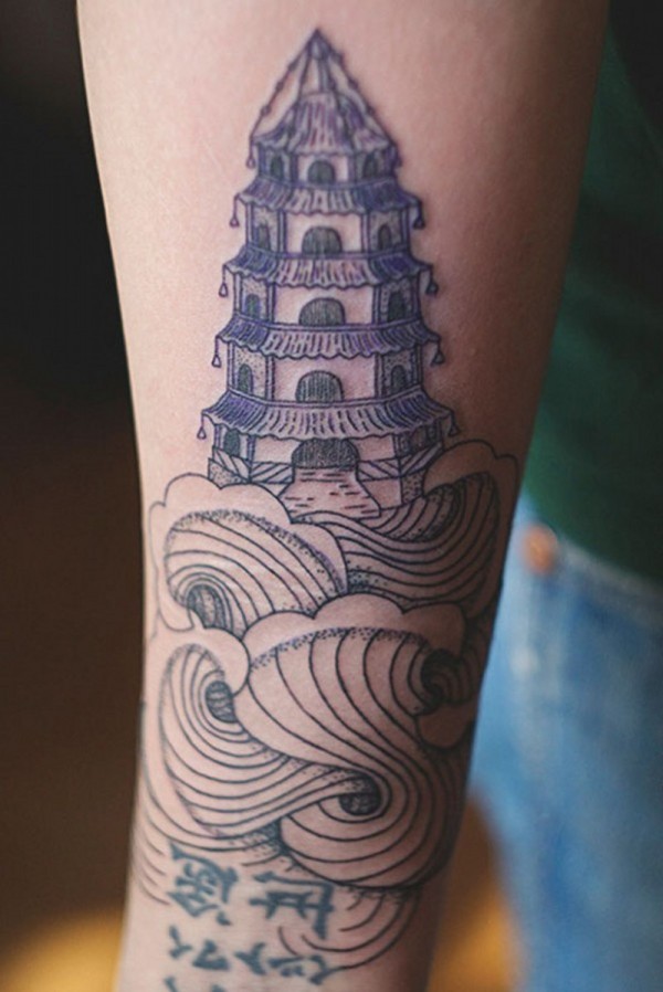 小臂蓝色线条寺庙纹身图案