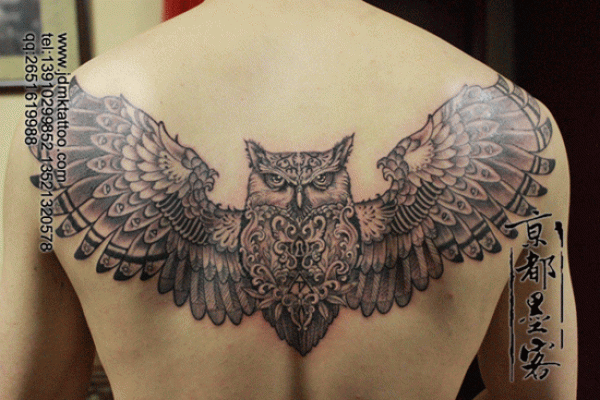 京都墨客纹身作品 后背猫头鹰展翅黑白纹身