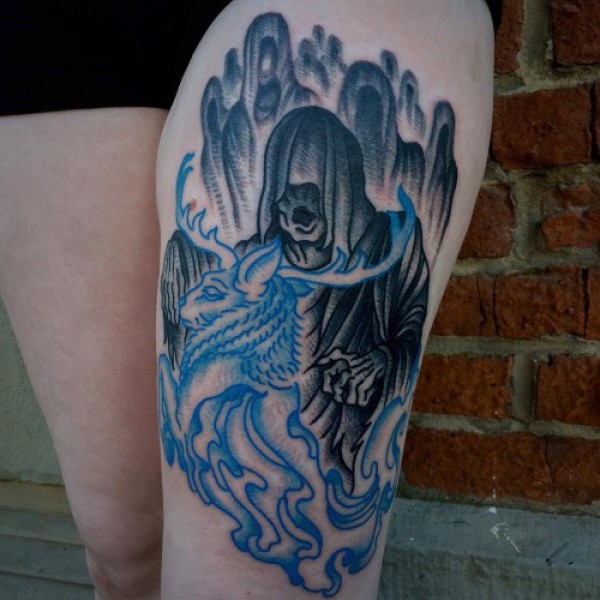 大腿old school神秘怪物和麋鹿幽灵纹身图案