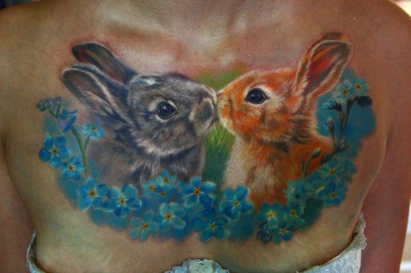 胸部可爱的写实彩色兔子纹身图案