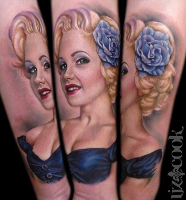 小臂可爱的女人肖像蓝色花朵纹身图案