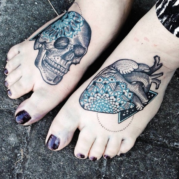 肩部雕刻风格心脏和骷髅蓝色梵花纹身图案