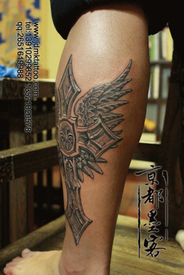 京都墨客纹身作品 男士腿部十字架黑白纹身