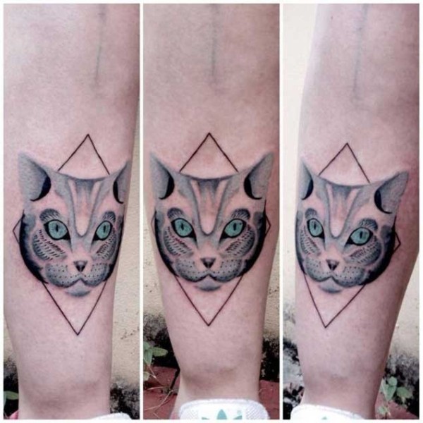 神秘的猫脸蓝色眼睛和几何图形纹身图案