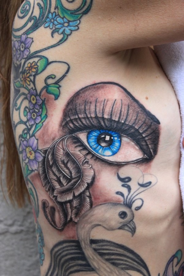 侧肋逼真华丽的蓝色大眼睛纹身图案