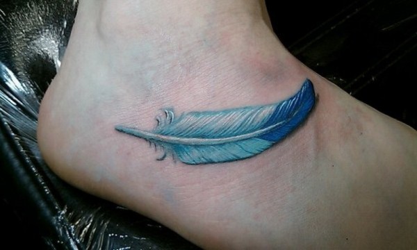 脚背可爱的蓝色羽毛纹身图案