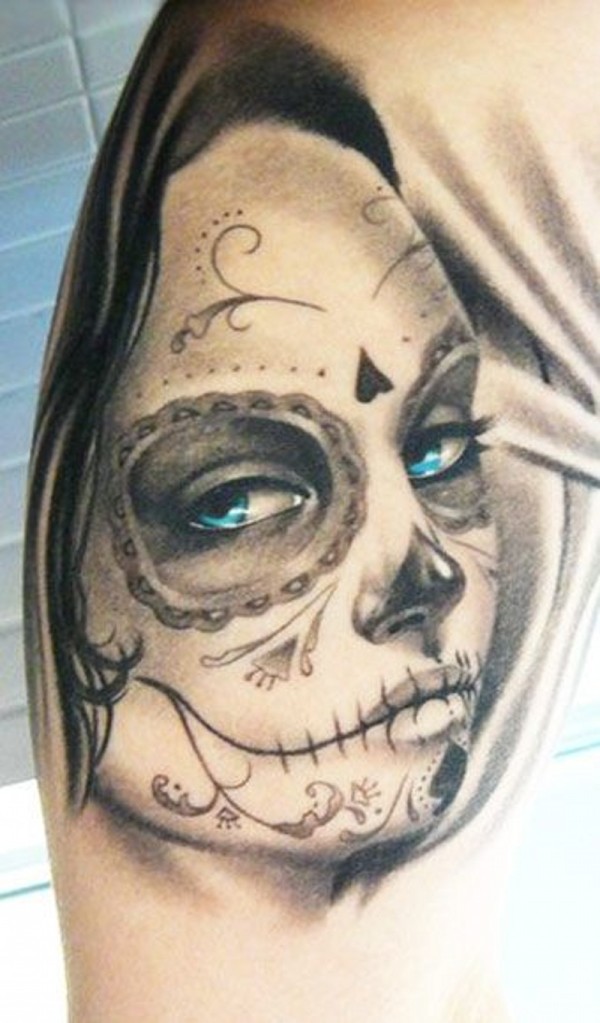 漂亮的黑灰死亡女孩和蓝眼睛纹身图案